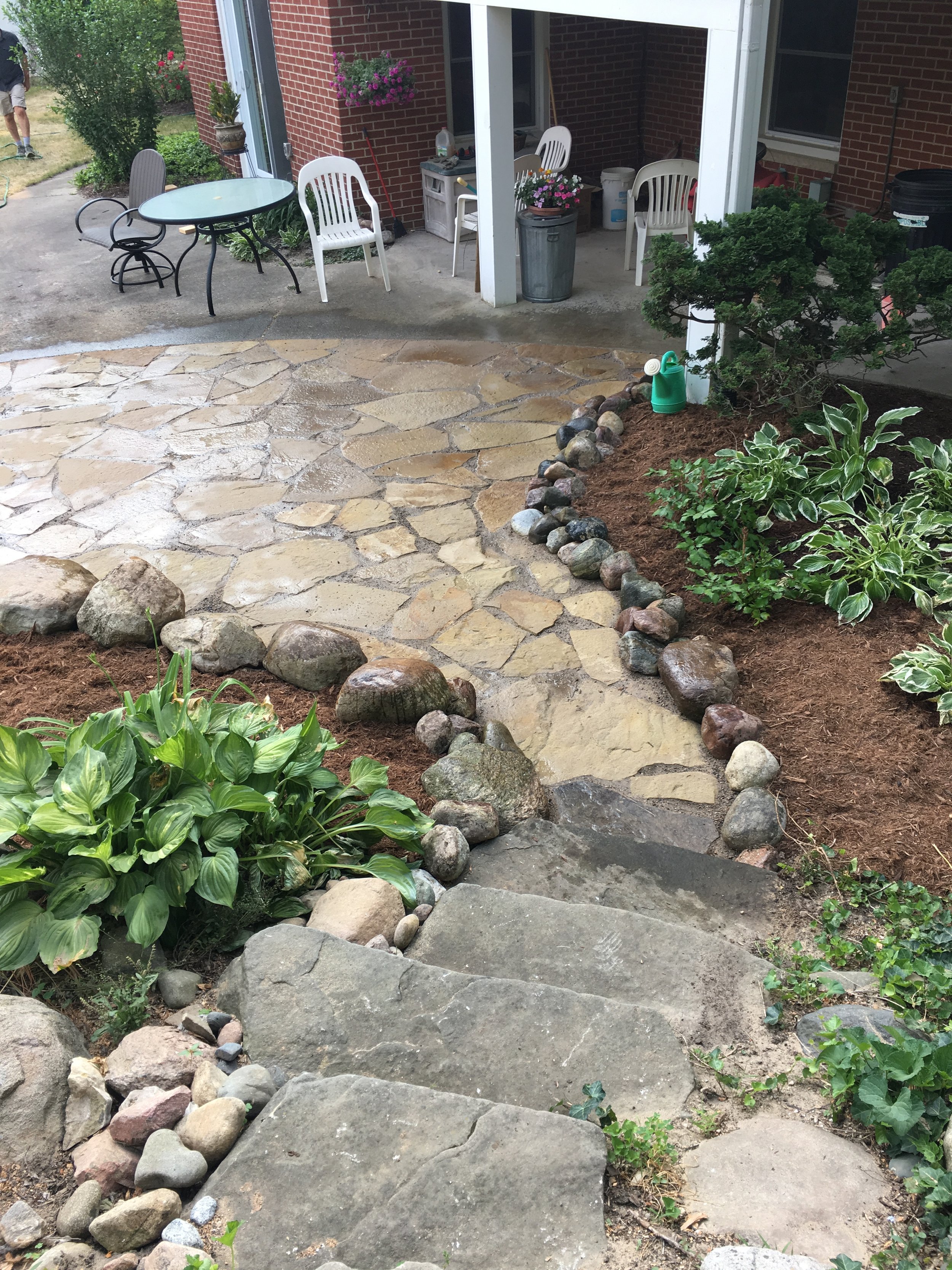 Stone patio and steps surrounded by small boulders and garden beds of Hosta plants.