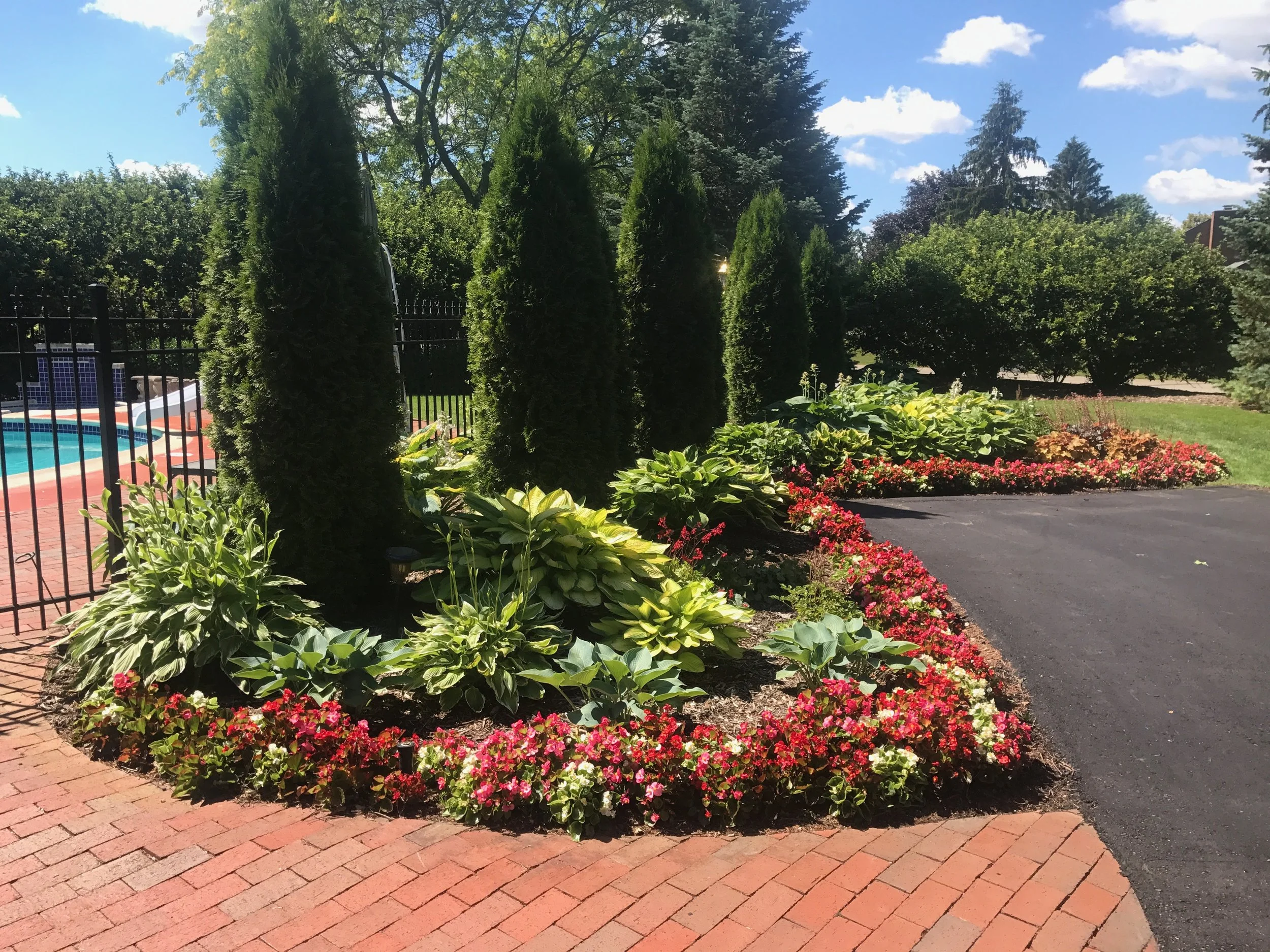 Annual Begonias flanking a bed of Hosta plants and Arborvitaes trees.