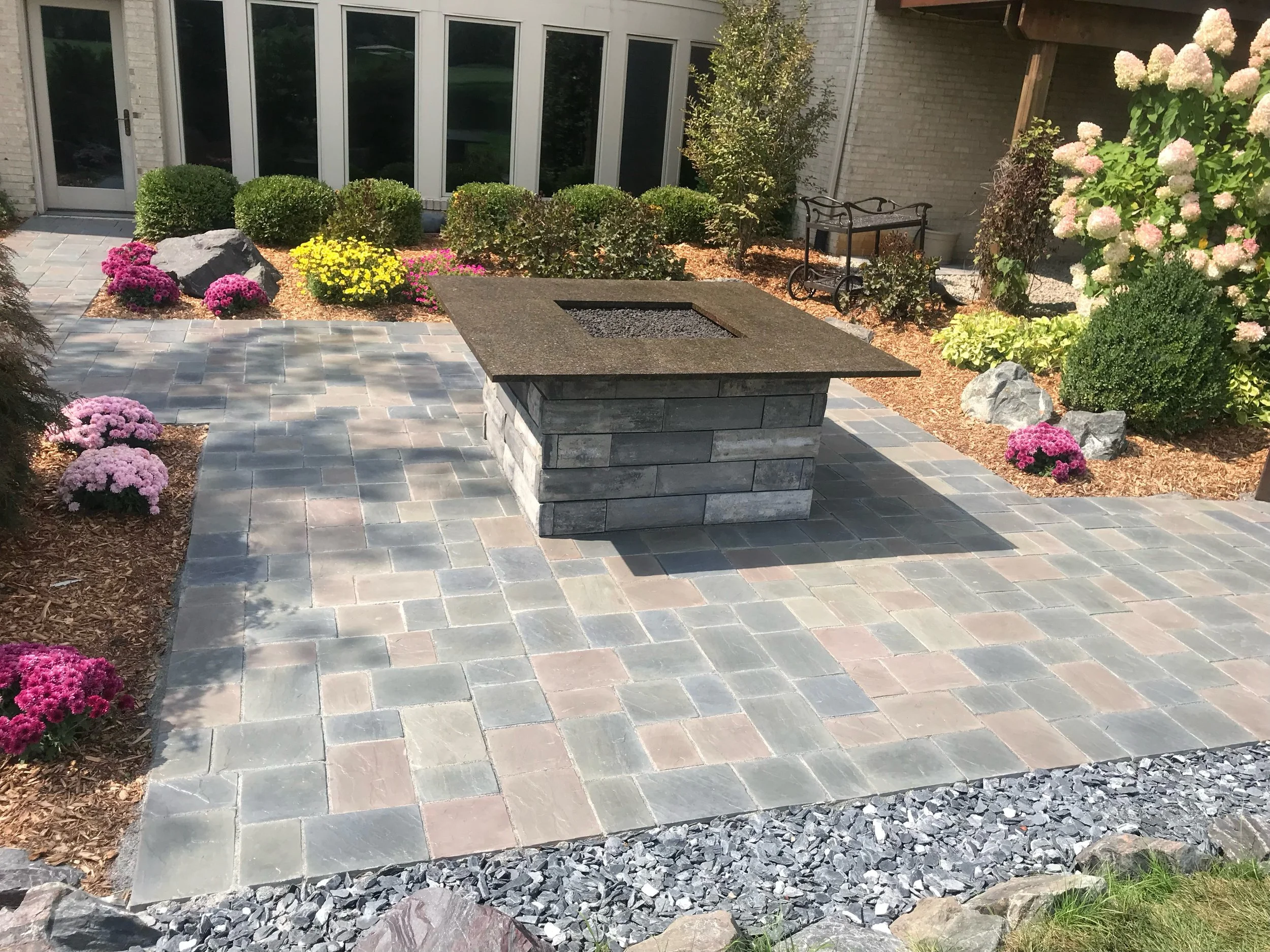 Paver patio and firepit surrounded by mulched garden beds of annuals, shrubs, and trees.