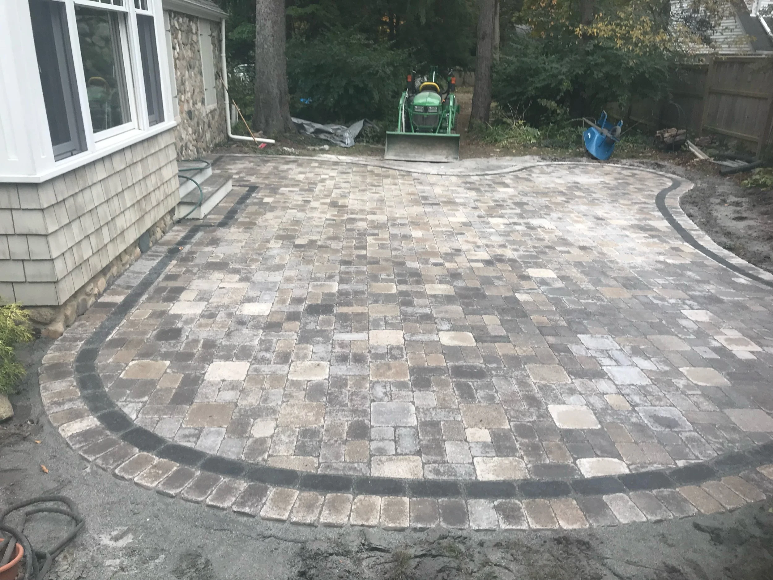 Curved paver patio ready for grass to be planted around the perimeter.